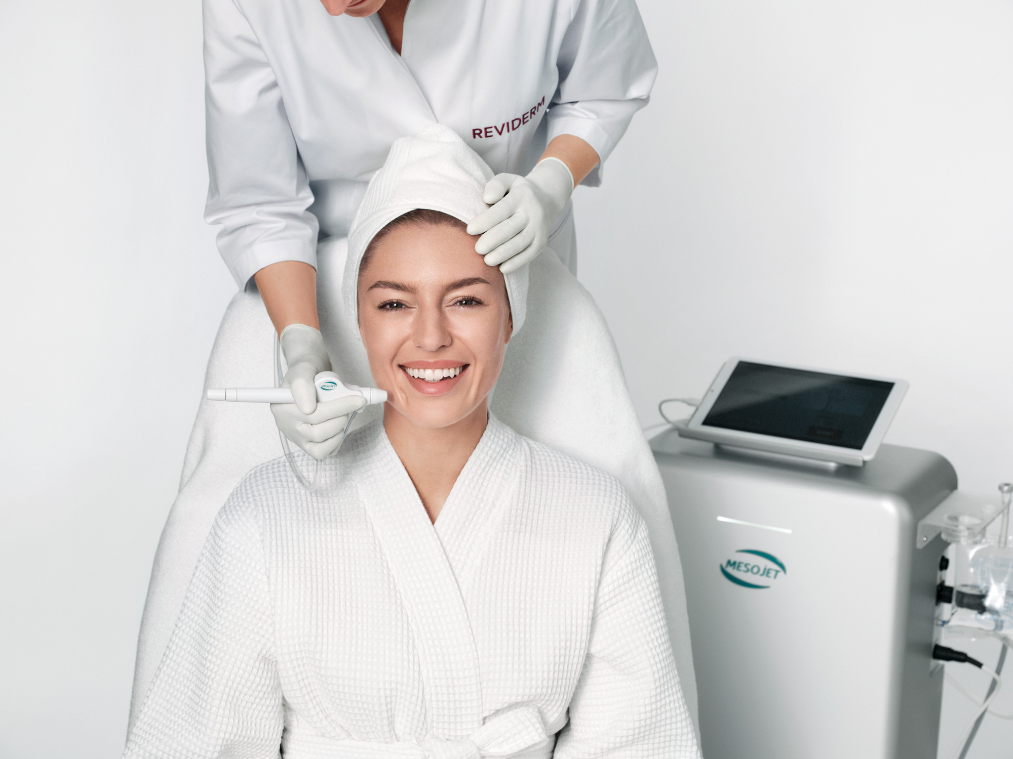 Der MesoJet™ von REVIDERM ist ein Gerät für die transdermale Mesotherapie. Dabei werden funktionale Wirkstoffe durch die Haut in tiefere Schichten eingeschleust. Dies kann helfen, das Erscheinungsbild von Falten und Pigmentflecken zu reduzieren, die Haut zu straffen und zu glätten sowie sie mit Feuchtigkeit zu versorgen.
